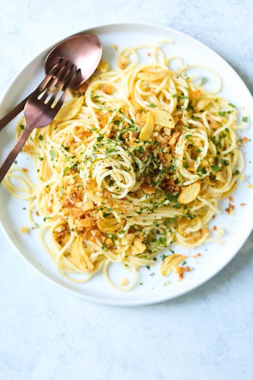 Damn Delicious’ spaghetti aglio e olio is cheap cheap — a super-affordable 30-minute meal of pasta topped with breadcrumbs, garlic, Parmesan, olive oil, salt, pepper, and red pepper flakes. Serve it with a salad and you’re golden, I say.