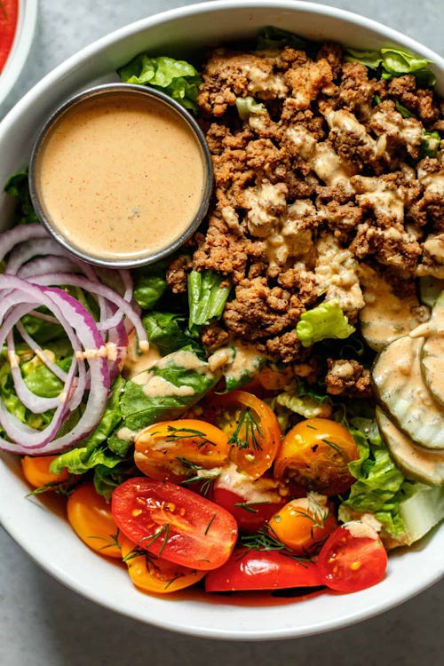 Ground beef is one of those things most families keep in the fridge, which means spaghetti, tacos, or burgers are evergreen options. If you want to change it up just a little, you could make All The Healthy Things’ burger bowls, which give you the same classic flavor combos of a burger but over greens instead of on a bun.