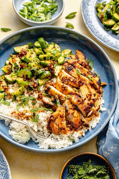 I love a good chicken thigh recipe, especially because they’re on sale so often at the grocery stores where I live. These red curry chicken thighs from All The Healthy Things only require a few seasonings to dress them up, and she serves them with a simple garlic rice and spicy cucumber salad.
