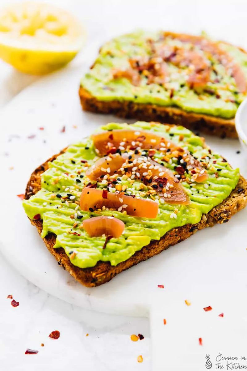 Jessica in the Kitchen’s version is a perfect example. Church up some nice bread with avocados and your toppings of choice. Hers includes pickled onions and everything but the bagel seasoning. Personally, I like mine topped with a runny egg, feta, and chili crunch.