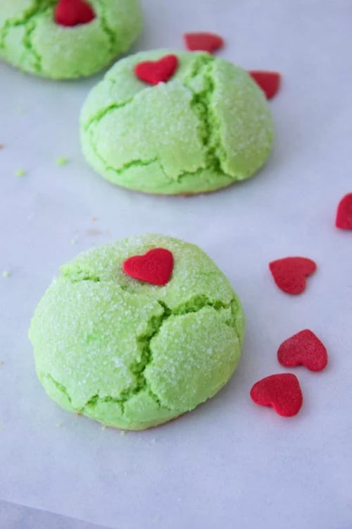 Laughing Spatula’s Grinch cookies are the cutest crinkle cookie I’ve ever seen. You’ll need special heart sprinkles or candies for the centers and some green food coloring, but if you bake much at all, you’ve already got everything else you need in the cupboard.