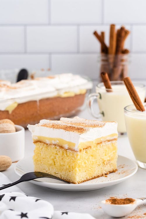 Eggnog lovers, this one’s for you: an eggnog poke cake courtesy of Princess Pinky Girl. Again, this recipe relies on a boxed cake mix base, so you don’t need to have any flour or sugar on hand to pull it off. (Side note: her red velvet Christmas poke cake looks amazing too.)