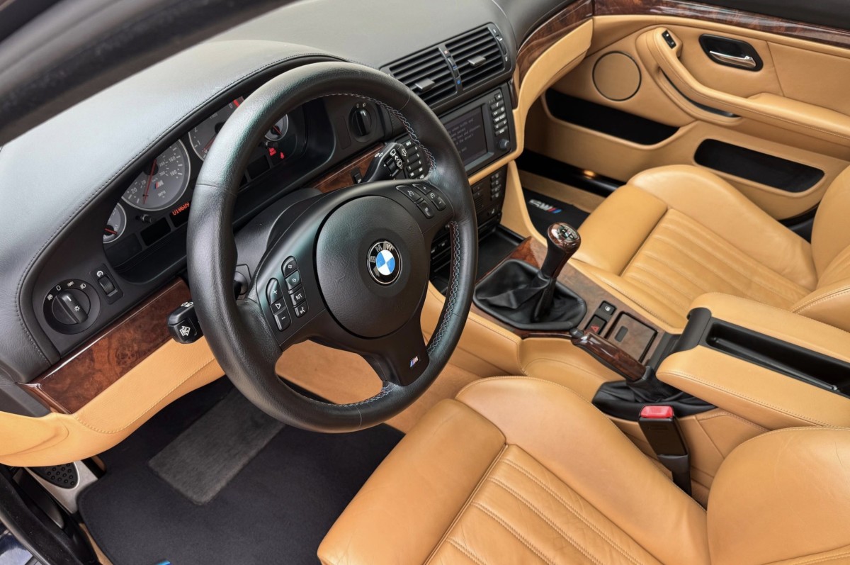 Finished in Carbon Black Metallic over Caramel Nappa Heritage leather, this E39 is stealthy on the outside and classically luxurious from behind the wheel. In place of the all-new M5’s garish interior lighting are glossy wood inserts, and everything—from the analog gauges to the angled center stack—is easy to figure out at a glance.