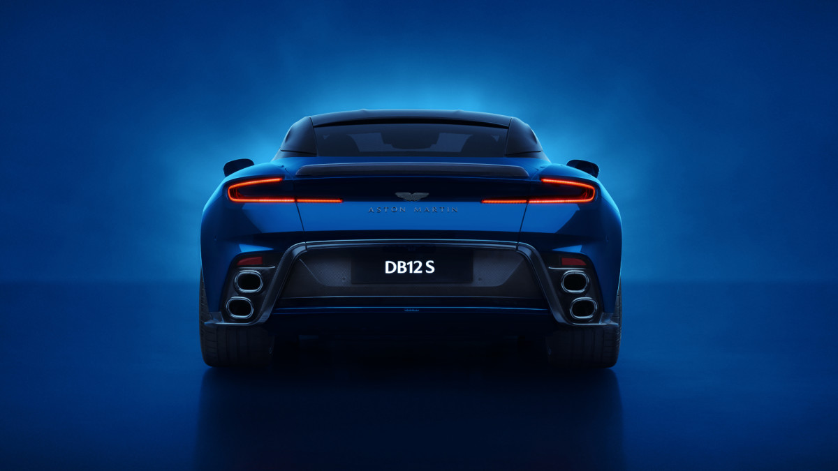 A near rear diffuser in a wider rear bumper is said to reduce lift, and it houses stacked tailpipes on either side (the regular DB12 has just one exhaust outlet per side).