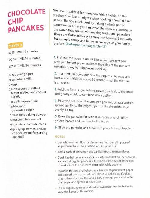 In her new cookbook, Dinnertime SOS, Palanjian has just the solution — sheet chocolate chip pancakes, or “square pancakes,” as her kids call them. You can make them the night before and pop them in the microwave in the morning. Oh, and they basically taste like cake!