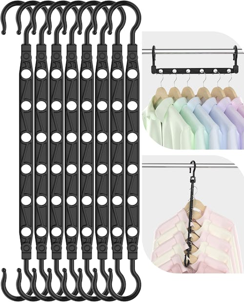 These hangers are for anyone whose closet is nearly full to the brim. Each space-saving hanger holds multiple garments vertically, turning wasted space under the rod into extra storage. The hangers arrive fully assembled and swivel 360 degrees so you can see everything easily, and the reinforced design is made to be strong enough for heavier pieces.