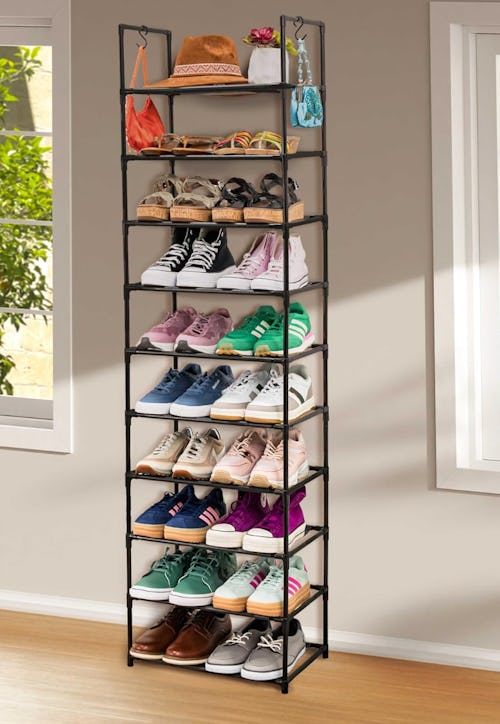 If your shoes keep staging a coup in the closet, this 10-tier rack will bring order to the chaos. The slim vertical frame holds 20 to 30 pairs without eating floor space, and the metal poles and non-woven shelves stay sturdy even with heavy boots. It’s easy to assemble, stackable if you want more room, and comes with hooks and an anti-tip kit.