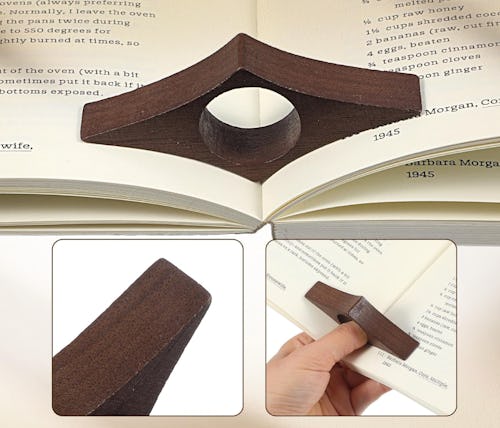 This wooden page holder makes reading so much easier — it fits over your thumb and props your book wide open so you can sip coffee, ride the subway, or cuddle your dog mid-chapter. Hand-crafted from smooth walnut, the holder is designed to be lightweight, portable, and can fit most thumbs.