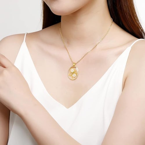 This necklace is a thoughtful gift because you can choose from a variety of styles based on their favorite flower or the flower that represents their birth month. The pendant is made of real pressed flowers encased in resin, which makes this such a bargain. The chain is crafted from platinum plated stainless steel that’s tarnish-resistant.