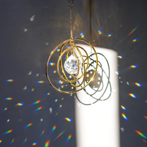 This sun catcher features four rotating rings with a crystal at the center — it looks like a galaxy around a sun. The high-grade K9 crystal easily refracts sunlight to create a stunning rainbow display on walls and ceilings. It’s easy to hang and can be placed indoors or outdoors to add a whimsical touch to any space.