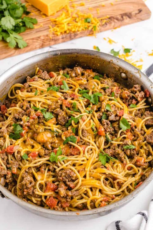This 30-minute recipe calls for ground beef, pasta, a can of Rotel tomatoes, onion, cheese, and taco seasoning (you can make your own blend instead of buying a premade one). It’s one of Princess Pinky Girl’s most visited and highest-rated recipes, so it has proven to be quite the crowd-pleaser despite its simplicity.