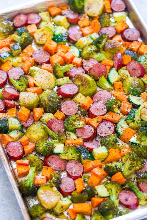 Averie Cooks’ recipe is a one-pan dinner that also happens to be pretty affordable. Sausage is a cheaper protein source, and a few fresh veggies will go far. All you have to do is chop and jazz them up with some seasonings you likely already have at home and roast to perfection.