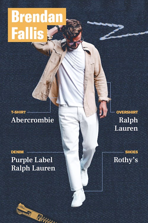 Brendan Fallis dresses for his future self. “When looking back years from now,” he says, he wants simply “to not be appalled by my choices.” He’s clearly making good headway toward this goal, with choices that include a lot of white — sneakers, shirts, pants — an affinity he gets from his dad, who always donned a crisp white shirt. Brendan is a master of elevated simplicity and this is undeniably expressed through his sense of personal style.