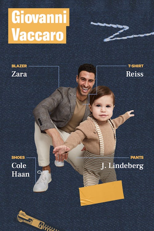 You won’t find Giovanni Vaccaro roaming the streets in sweats. Vaccaro is a put-together dresser, someone who swears by a tailored J. Lindenberg blazer, crisp button-down, chinos, and a clean white pair of Cole Haans. He’s a dad who feels the responsibility to “take great care of my health and appearance because it matters to me … and I want to represent myself and my family in the best way possible.” That is to say nothing of his son’s clear flair for style — I mean, who else can pull off striped overalls like that? Vacarro strives for intentional sophistication and it’s pretty clear that it runs in the family.