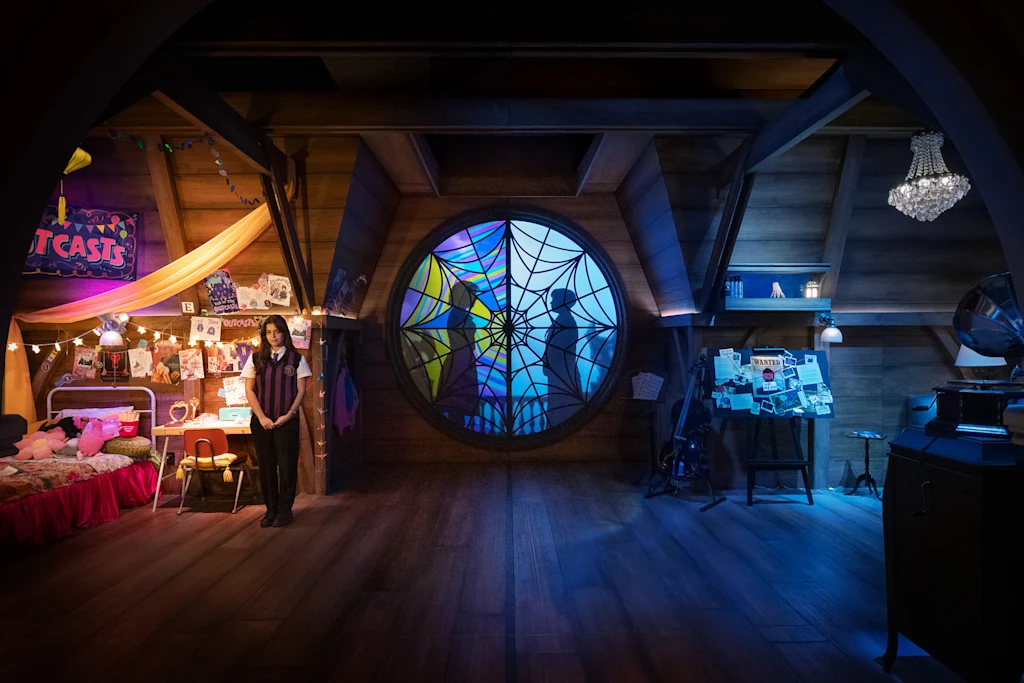 Wednesday’s exhibit is more freeform for you to explore as you like. It kicks off with a truly jaw dropping reveal as you step right into her bedroom—a transportive, picture perfect recreation of the show. Her bubbly roommate, Enit, appears with her in silhouette behind the large window to kick off the story. It opens to reveal a maudlin carnival (complete with a laser crossbow shooting range and spinning wheel that will reveal how you will die).