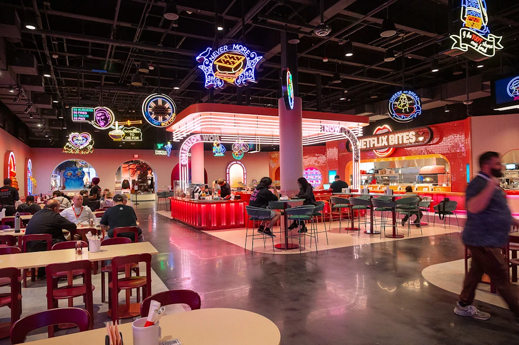 The restaurant called Netflix Bites, meanwhile, juggles a vibe between high touch entertainment and mall food court. Greg Lombardo, VP and head of live experiences at Netflix, says he’s after an “elevated diner concept.” The menu is amusing. It offers fan service items like Red Bite, Green Bite chicken referencing Squid Game, and a 2lb pretzel that celebrates how every Netflix story has a big twist.