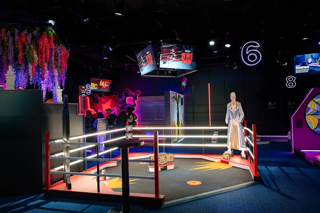 At night, a centrally positioned bar is sure to spill over into the attached Top Nine mini golf course, where the goal is to get a high score rather than low. Each hole represents a different show, and RFID balls mean your strokes are tracked automatically. A WWE hole urges you to bounce the ball off the ropes. An Is it Cake hole shows you a clip and makes you properly guess, is it cake? to get the highest score route opened. A One Piece hole actually places two putters against one other, head-to-head, each putting as fast as they can to fire cannonballs in a Skeeball-style arrangement to sink the other ship first.