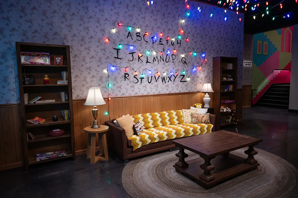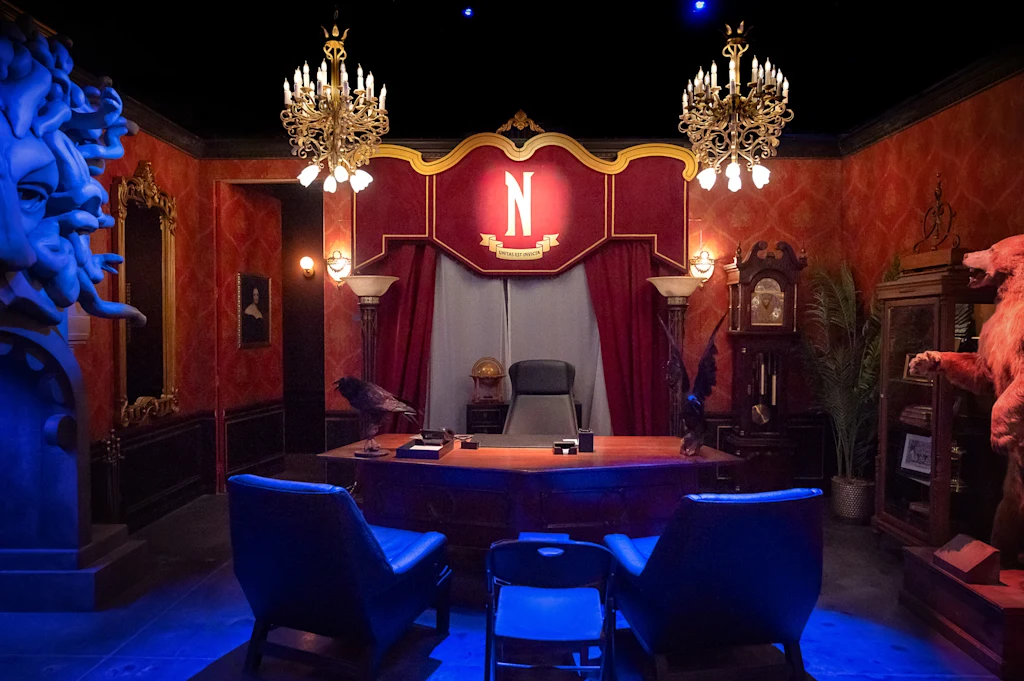 On the walls, you’ll see every Netflix thing you know—a 10-foot Thing hand from Wednesday, a spooky mansion from Stranger Things, an upside down, floating chess set from Queen’s Gambit.