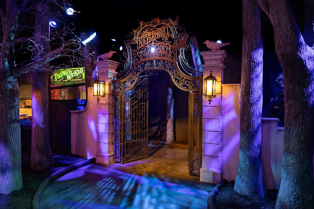 Instead of escaping, you’re there to play. But you can also follow along with a mystery on your phone…which will draw you deeper into Wednesday’s built world, from the carnival, through a forest, into more striking Wednesday sets like the headmaster’s office where you can hunt for clues.