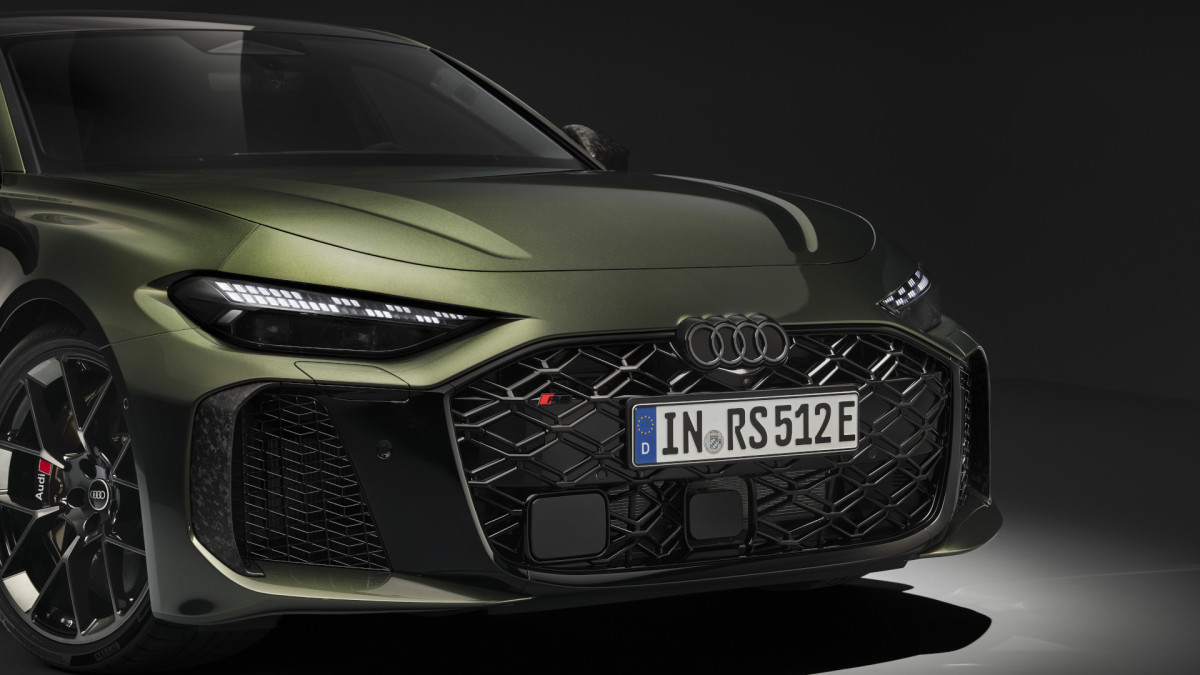 The massive Singleframe honeycomb front grille looks like a catfish’s mouth from some angles, bleeding into gloss black lower side intakes, but with the optional Carbon Design Package, these can be finished in carbon fiber, as can the wing mirror caps and rear diffuser trim. Matrix LED headlights can show an RS-specific light signature with a checkered-flag motif, and the OLED taillights also have an RS-specific look when locking or unlocking the car, continuing Audi’s signature evolution of the tech. These can even show special warning symbols to warn other drivers of accidents or breakdowns on the road ahead. Vents behind the front wheels show the RS 5’s relation to the 8Y RS 3, and unlike the M3 that uses the same rear doors as the base 3 Series, the RS 5’s muscular bulges aren’t awkwardly integrated. The tall diffuser houses an F1-style reflector (not a light) between two enormous oval exhaust tips. What about paint?