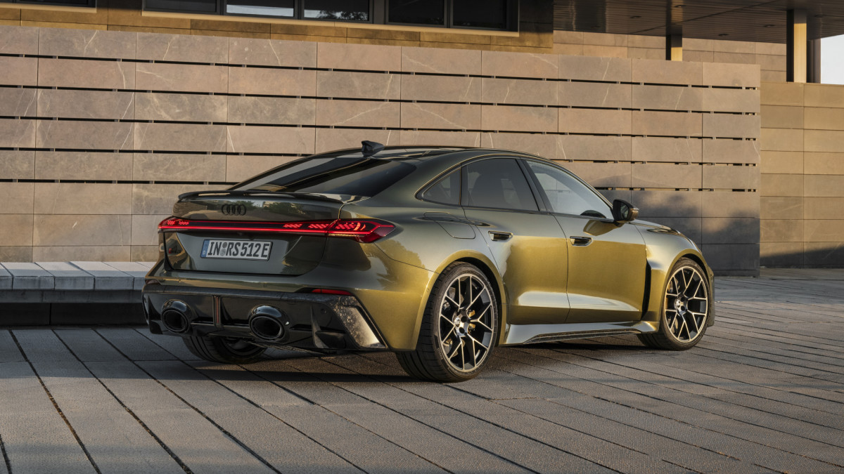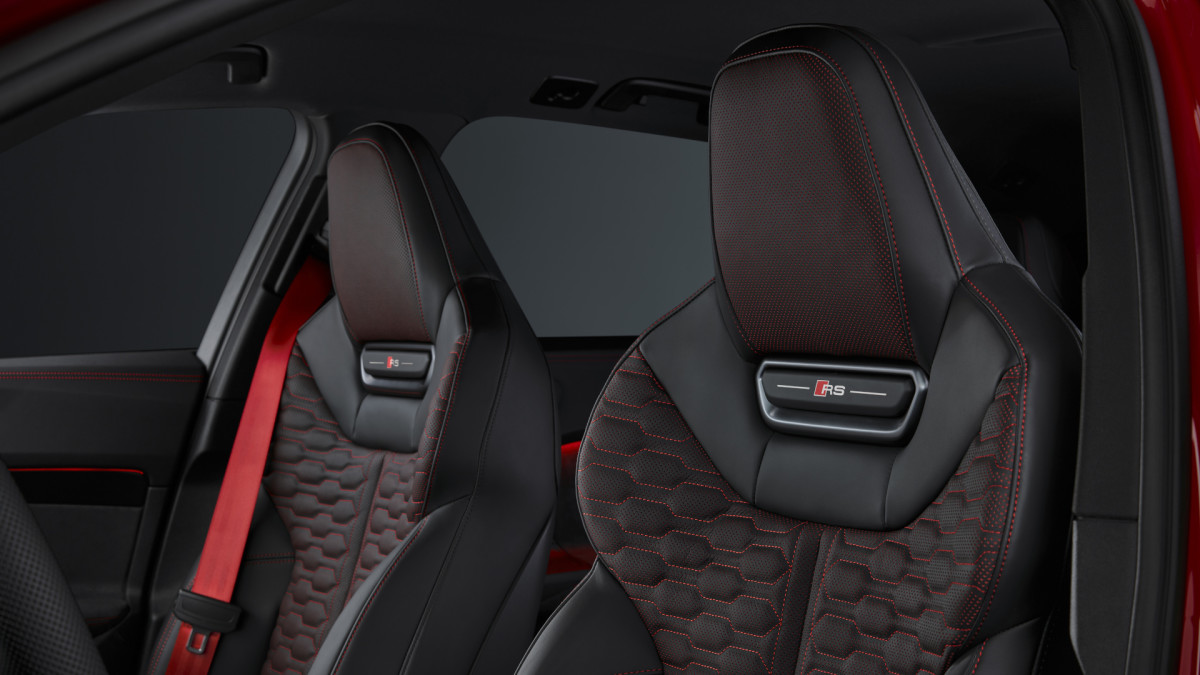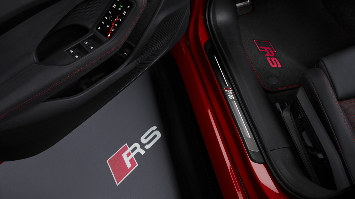 Like the A5, the center of the dash features a 14.5-inch MMI curved OLED touchscreen that can show a visualization of energy flows under acceleration or when regenerating energy under braking, as well as readouts for the temperatures of the tires, transmission, and rear transaxle. The driver gets an 11.9-inch screen behind the squared wheel, which has RS and boost buttons, plus a noon marker, in red. The passenger also gets a screen, like in a Ferrari 12Cilindri, measuring 10.9 inches, but unlike the Ferrari, this comes standard. Naturally, the screens have RS-specific features, like displays for engine RPM, speed, and a shift light. There are also modes showing G forces, pressures and temperatures for individual tires, lap times, and other performance data like power and acceleration. Optionally, a configurable head-up display shows RPM, speed, and the selected gear, and this can be shown as a dial. The HUD also includes a shift indicator and acceleration readouts, and there’s a launch control guide for maximum explosiveness off the line.