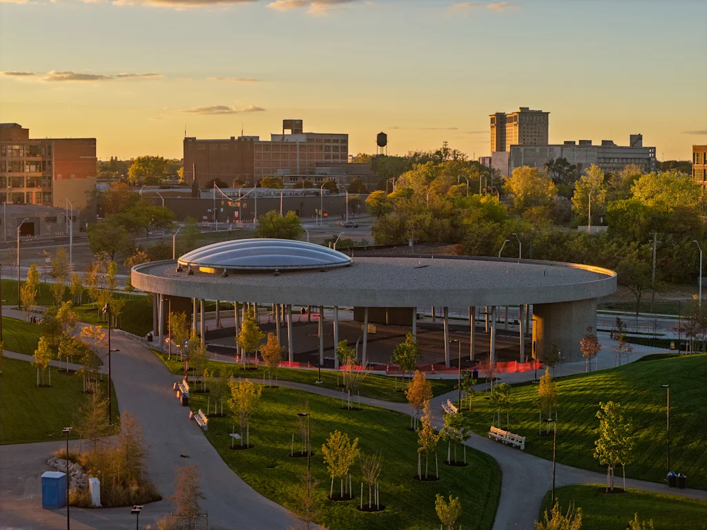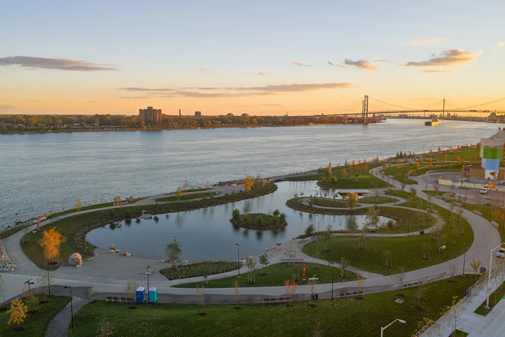 The project was led by the Detroit Riverfront Conservancy, a nonprofit established in 2003 to reconnect the city with a formerly industrial riverfront that had devolved into abandonment and contamination. In the decades since, the organization has invested more than $300 million building out riverfront parks, public spaces, and a nearly 5.5-mile continuous riverwalk along the water. The site of Ralph C. Wilson Park, just west of downtown, had been an underutilized green space for years but suffered by being cut off from its surroundings by a railyard and a derelict parking lot.