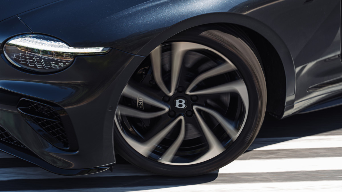 The Continental GT S stands apart from the regular Conti GT with several gloss black accents as part of the Blackline Specification, starting with the front lower spoiler and extending to the matrix grilles, wings badges, and BENTLEY wordmark. The area around the lower side intakes is also framed by glossy black paint, as is the glasshouse, and the chrome strips on the lower section of the side bodywork, which extend into the rear bumper, are now gloss black, too. Similarly, the mirror caps, rear diffuser, and sill extensions are finished in Beluga black, and the LED matrix headlights are tinted, as on the GT Speed. To match, the taillights get the same sort of treatment, as do the exhaust tips. 22-inch ten-spoke alloy wheels come in silver as standard, but two-tone wheels with black paint and machined faces are available, as are full gloss black wheels.