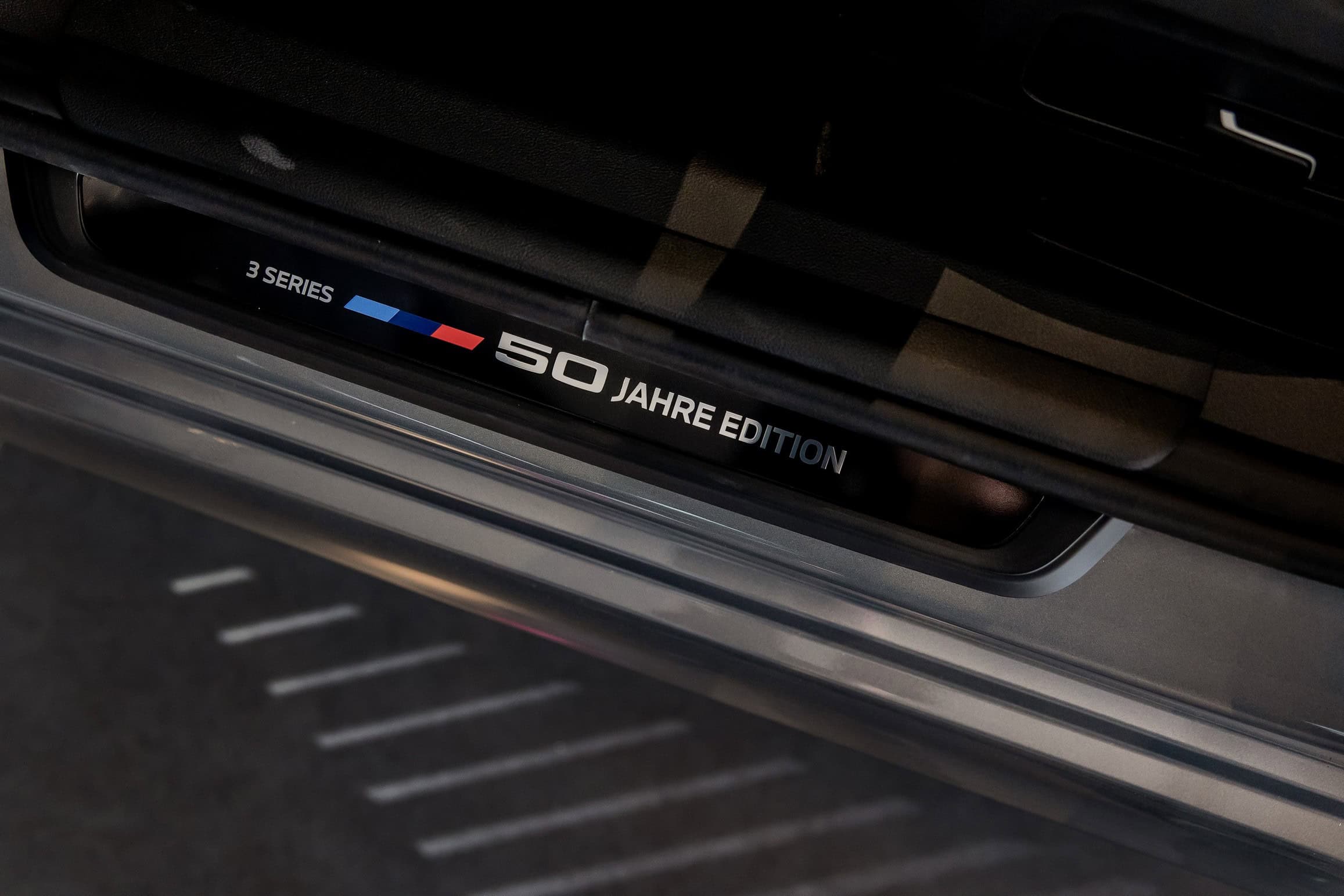 To complete the look, BMW Mexico darkens the side mirror caps and window trim. The red calipers of the M Sport brakes add a sharp contrast to the body, which gets a trunk lid spoiler and a sunroof as standard. Open the doors and you’re greeted by “3 Series 50 Jahre Edition” side sills with an M-colored motif.