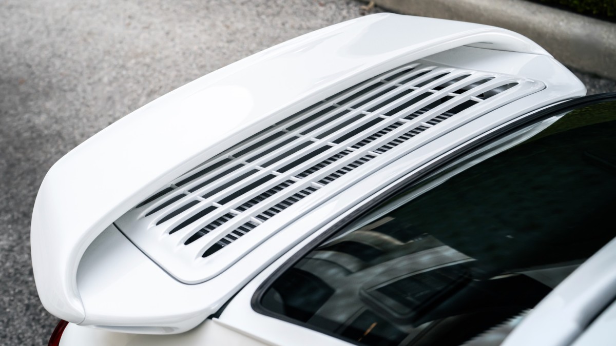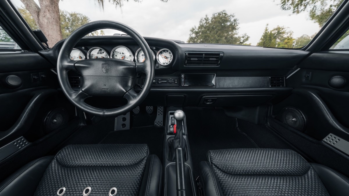 A combination of Icy White paint, gray 18-inch RS-style wheels (8.5 inches wide in front, 11 inches wide at the back), and clear turn signal lenses gives Project Gravette a desaturated appearance. The car wasn’t meant to represent a specific factory 911 model, but the wide-body design and tall rear wing are definitely 911 Turbo-like.