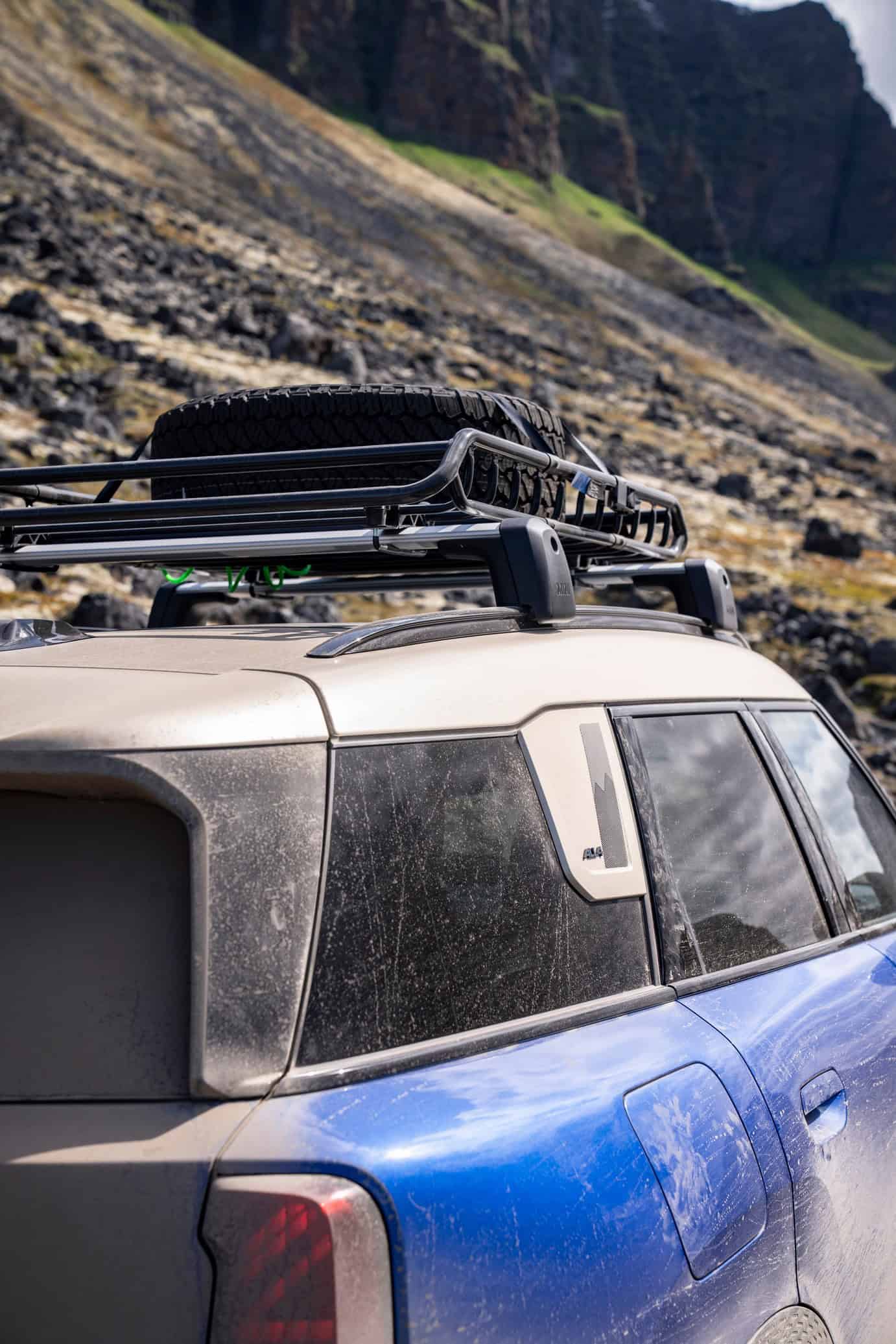 MINI selected the fully electric Countryman SE ALL4 for the adventure, finished in Blazing Blue and equipped with the Favoured Trim. Given the challenging route, the choice of all-terrain tires was a no-brainer. A roof rack carrying a spare wheel was also added, a sensible precaution considering the rough roads along the way.