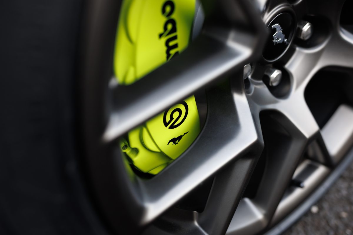 The car is finished in Avalanche Gray, accented by bright Hyper Lime brake calipers, seatbelts, and drift brake handle — though Ford will happily sell you a more subdued setup if highlighter yellow isn’t your vibe. A raised rear wing from the GT Performance Pack rounds out the look. Inside, subtle touches hint at the car’s purpose-built attitude, with unique trim and badges reminding you this isn’t your average EcoBoost Mustang.