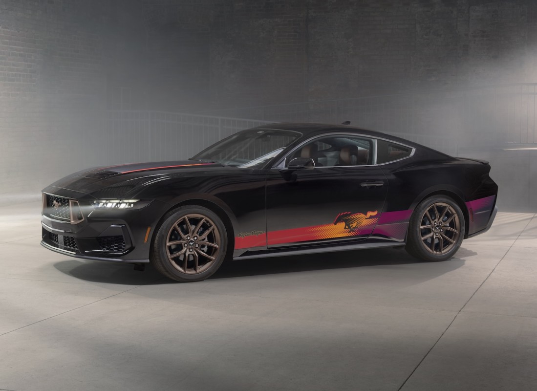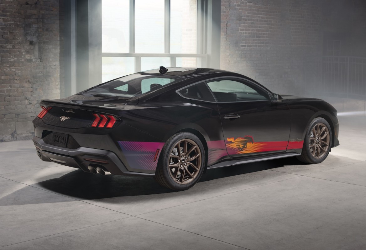 It only comes in Shadow Black, which sets the stage for the bold graphics running down the sides. Red, orange, purple, and yellow accents twist the usual pony badge and stretch across the bodywork. It looks more like something you’d see on a race car than a showroom floor.