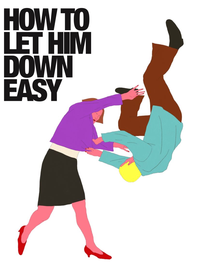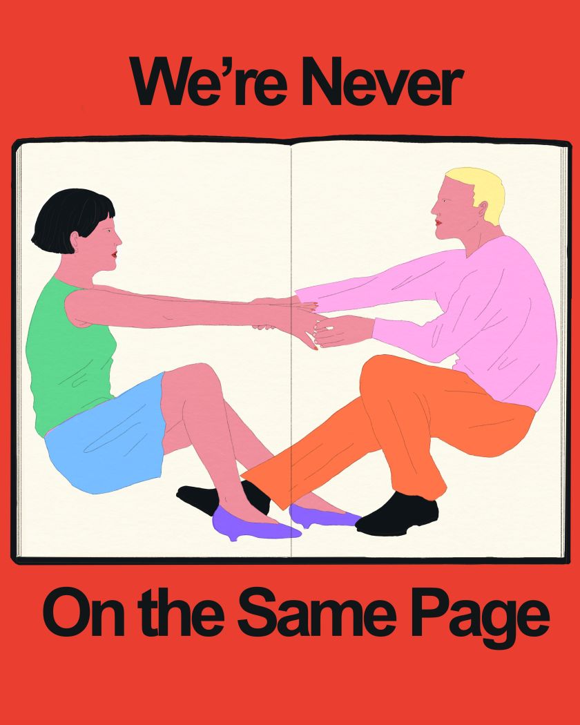 In one artwork, you’ll see the words “How to let him down easy”, the text slammed on the page in a chunky, bold sans-serif font. Next to it is an angry-looking character throwing the other down in what appears to be a cathartic tackle. The action is caught mid-air, the thump imminent. In another, which states “We’re never on the same page”, a couple are holding hands, leaning at opposite sides as they, quite literally, are spread out on different pages.