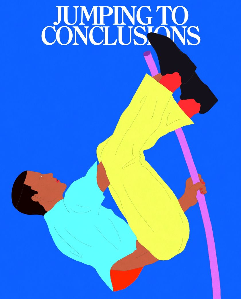 And in another, which declares “Jumping to conclusions”, there is a character doing a pole vault; the starting point and the finish line are uncertain. Whatever the situation, Kimberley’s characters are expressive and dressed to the nines (or maybe it’s more accurate to say a stylish office), mimicking the kinds of dating faux pas we’ve all experienced at one point or another.