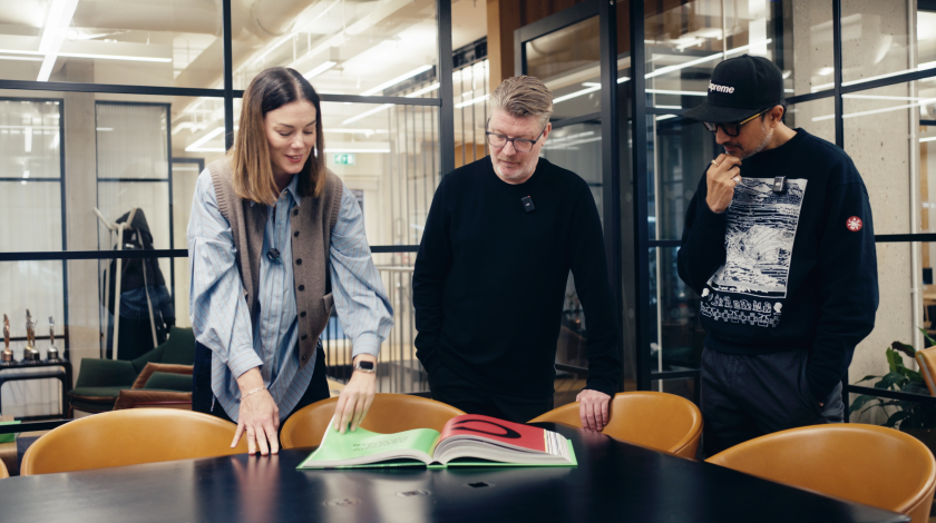 Physically, the studio is designed to keep the work visible and in motion. Downstairs, teams orbit across open desks: motion, designers, writers, strategy, growth. Projects don’t live quietly on servers; they spill onto the walls.