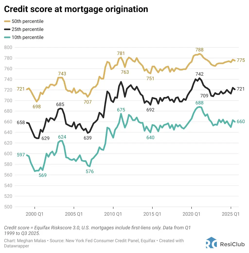 That challenge reflects a broader shift in the mortgage market. In Q1 1999, borrowers in the bottom 10th percentile of mortgage credit scores had scores of 597. By Q3 2025, that threshold had risen to 660, reflecting that many lower-credit households had been locked out of homeownership following the bust, Dobson says.