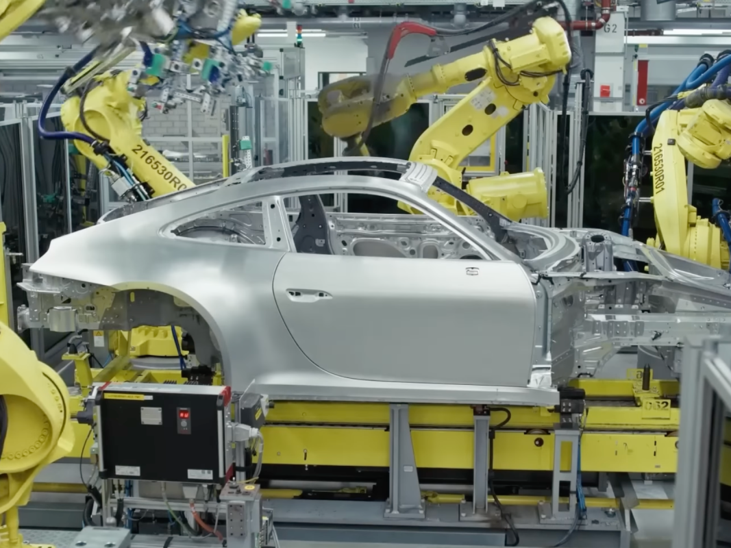 Each 911 starts on Zuffenhausen’s mixed-material production line, where an army of robotic arms manipulates stamped metal panels and structural components to form the timeless coupe silhouette. Conveyors shuttle the body-in-white across various stages, including the anti-corrosion immersion bath.