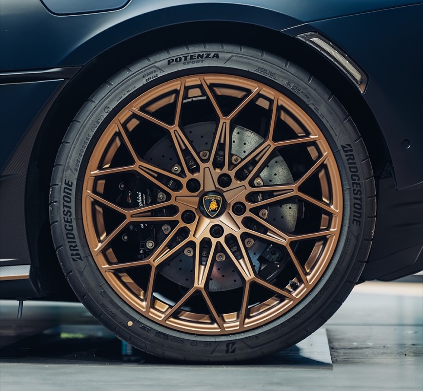The centerpiece here is the Blu Okeanos Matte finish. It’s a flat blue that tones down the car’s sharp surfaces without making them disappear. Lamborghini pairs it with forged Velador wheels in matte bronze, wrapped in Bridgestone Potenza rubber. The Alleggerita package adds more bronze elements, subtly decorating body panels and giving the car a slightly warmer look.