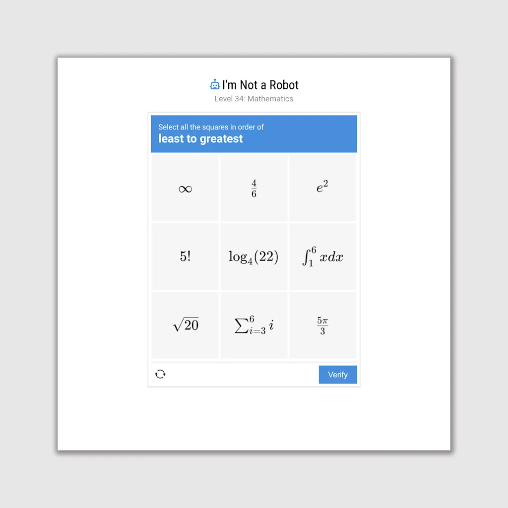 I myself am currently stuck on Level 24, which asks you to calculate the value of mathematical functions and sort them from lowest to highest. Considering the presence of logarithms, x’s, and a sigma, it has proven too head-cracking for my writerly brain, but for those who make it through to the end, Agarwal promises a certificate of humanity, and a surprise appearance by CAPTCHA founder Luis von Ahn, who went onto cofound Duolingo.