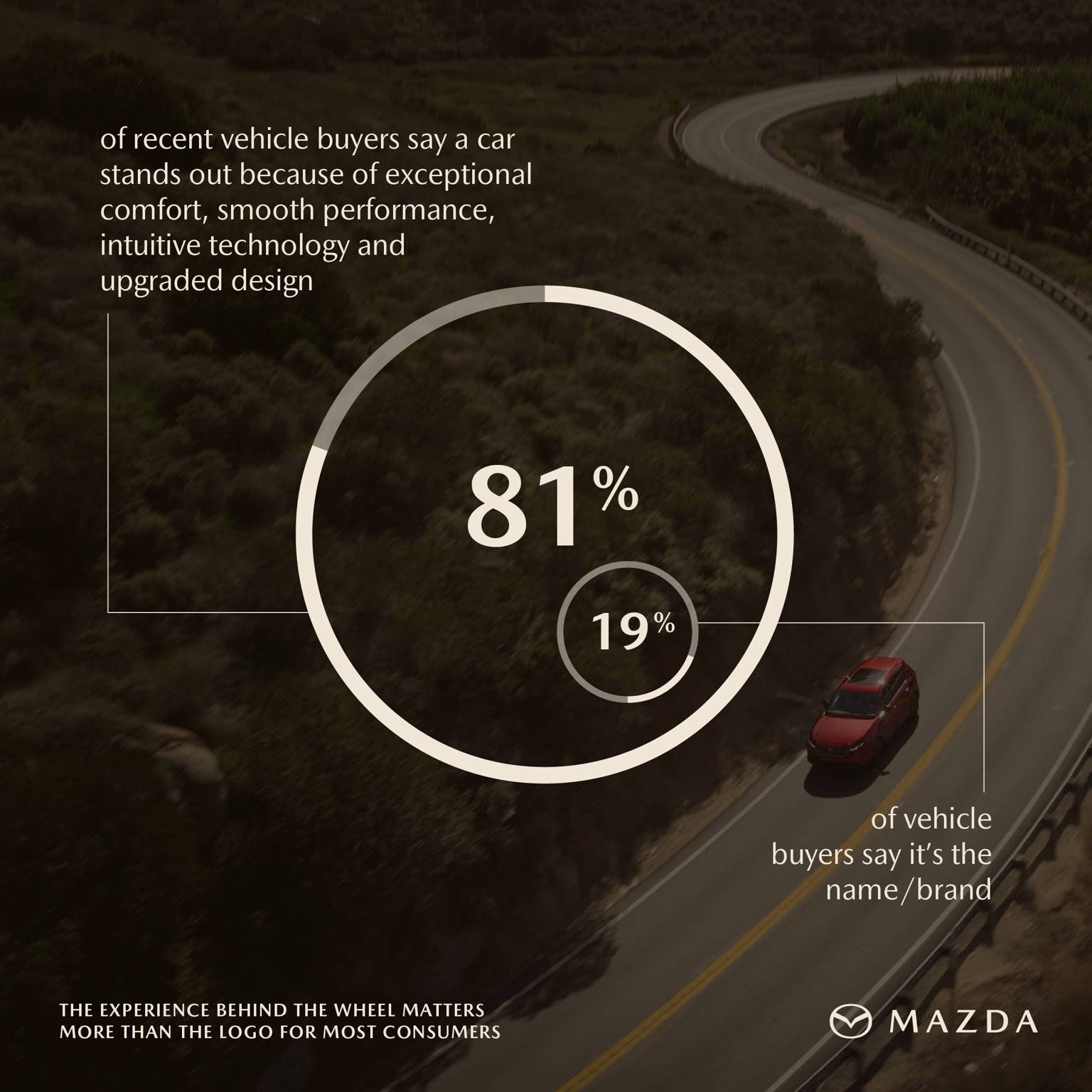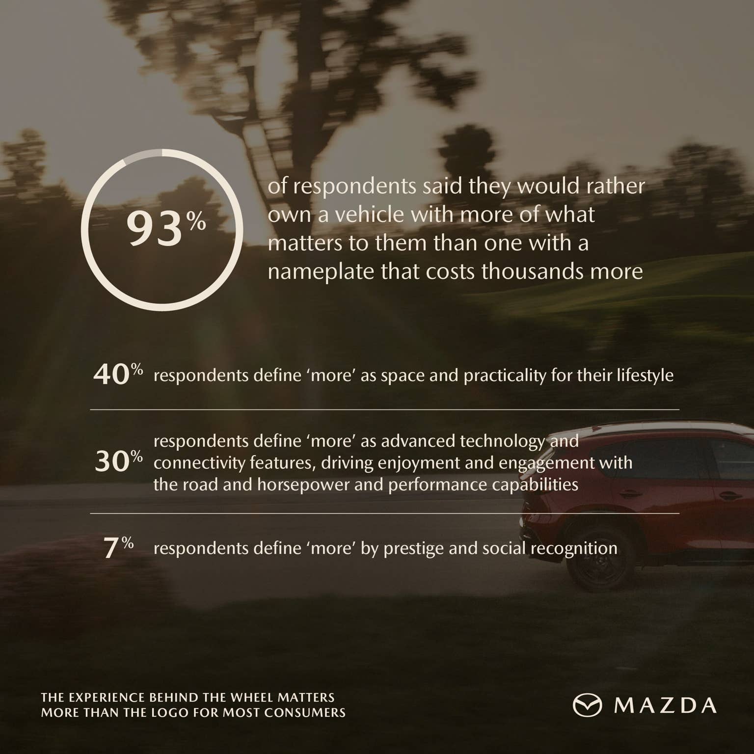 The results bolster Mazda’s case, given that its lineup delivers a near-luxury feel without the premium pricing. Looking at the numbers, 93% of respondents said they would rather own a vehicle with “more of what matters” to them than a more expensive one. That “more” was most commonly defined as space and practicality (40%), value and quality (36%), and advanced technology and connectivity, driving enjoyment, and performance capability (30% each).