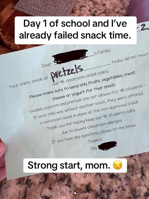 One mom is going viral after sharing a note he received from her kid’s school after sending pretzels as a snack, allegedly going against their “snack policy.”