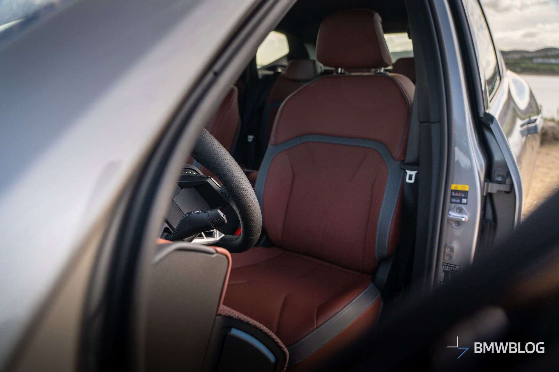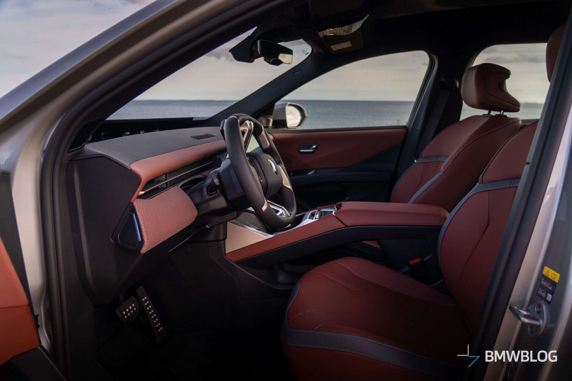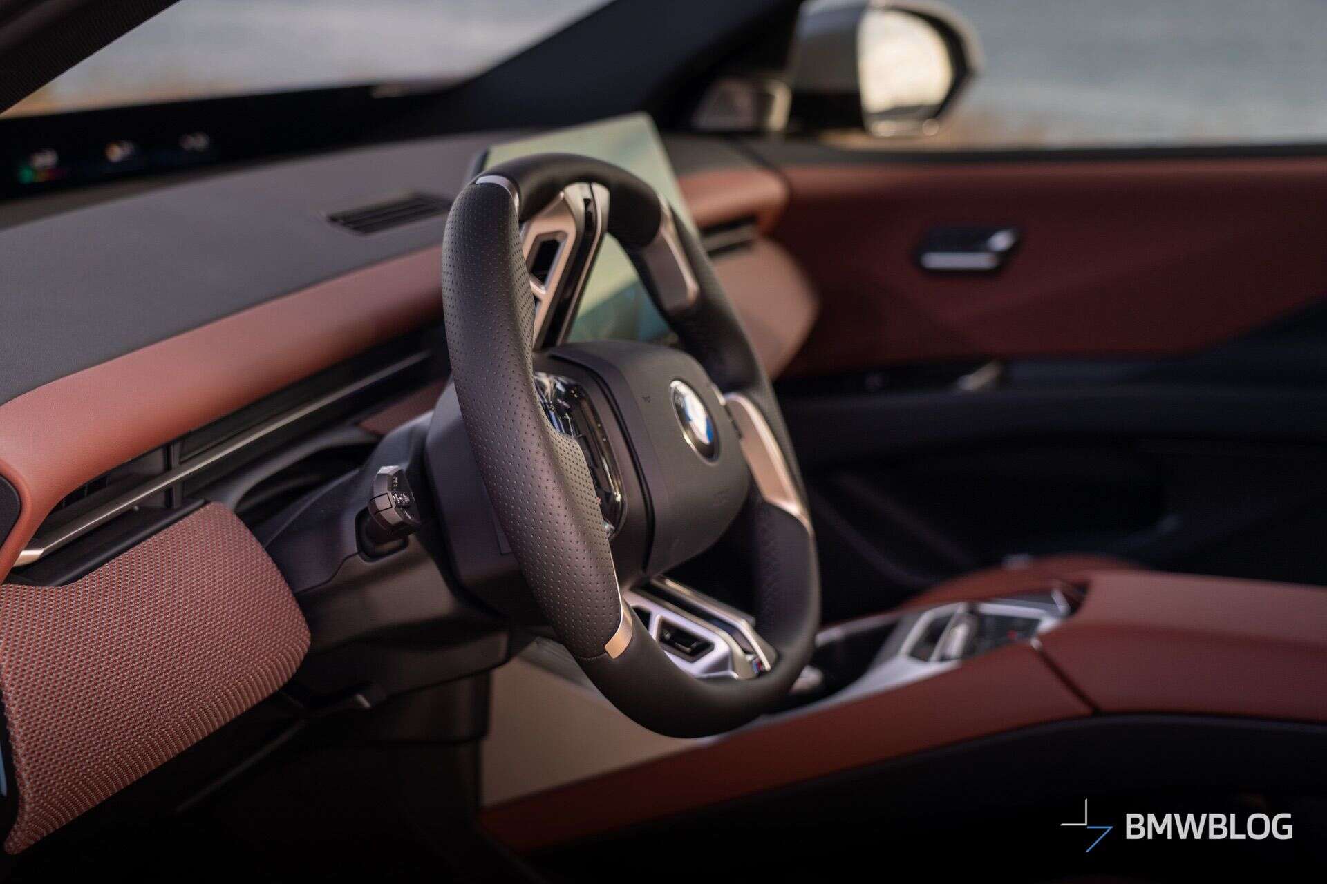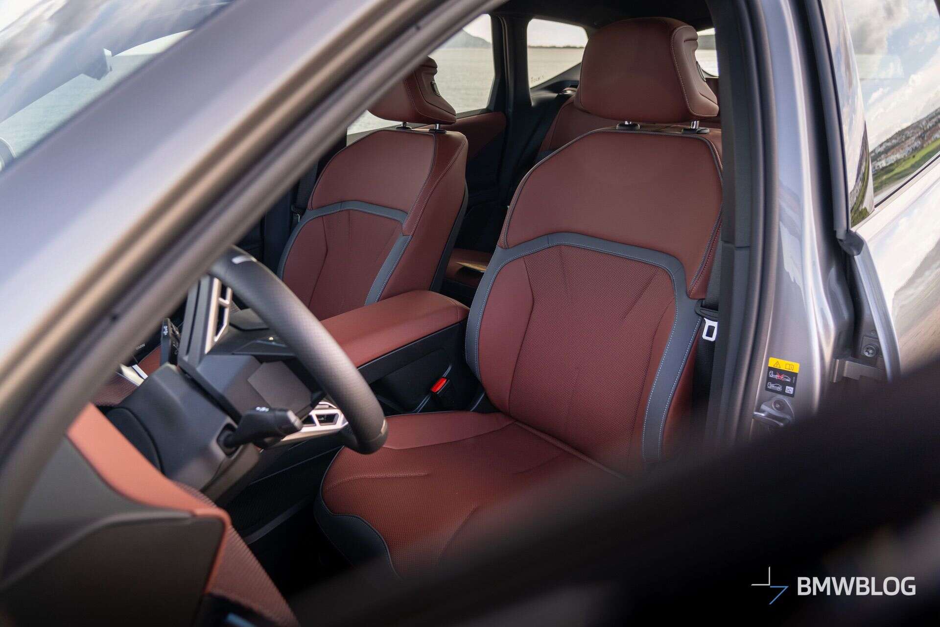 Inside is where the real treat awaits. The Castanea upholstery gives the cabin an upscale ambiance, even though it’s not genuine leather. It’s called Veganza in marketing jargon, a material said to have “leather-like characteristics.” The M badge on the steering wheel signals the upgraded design we’d definitely have over the standard wheel. It’s an option here on the 50 xDrive, but should come standard on the M Performance version, the M60.
