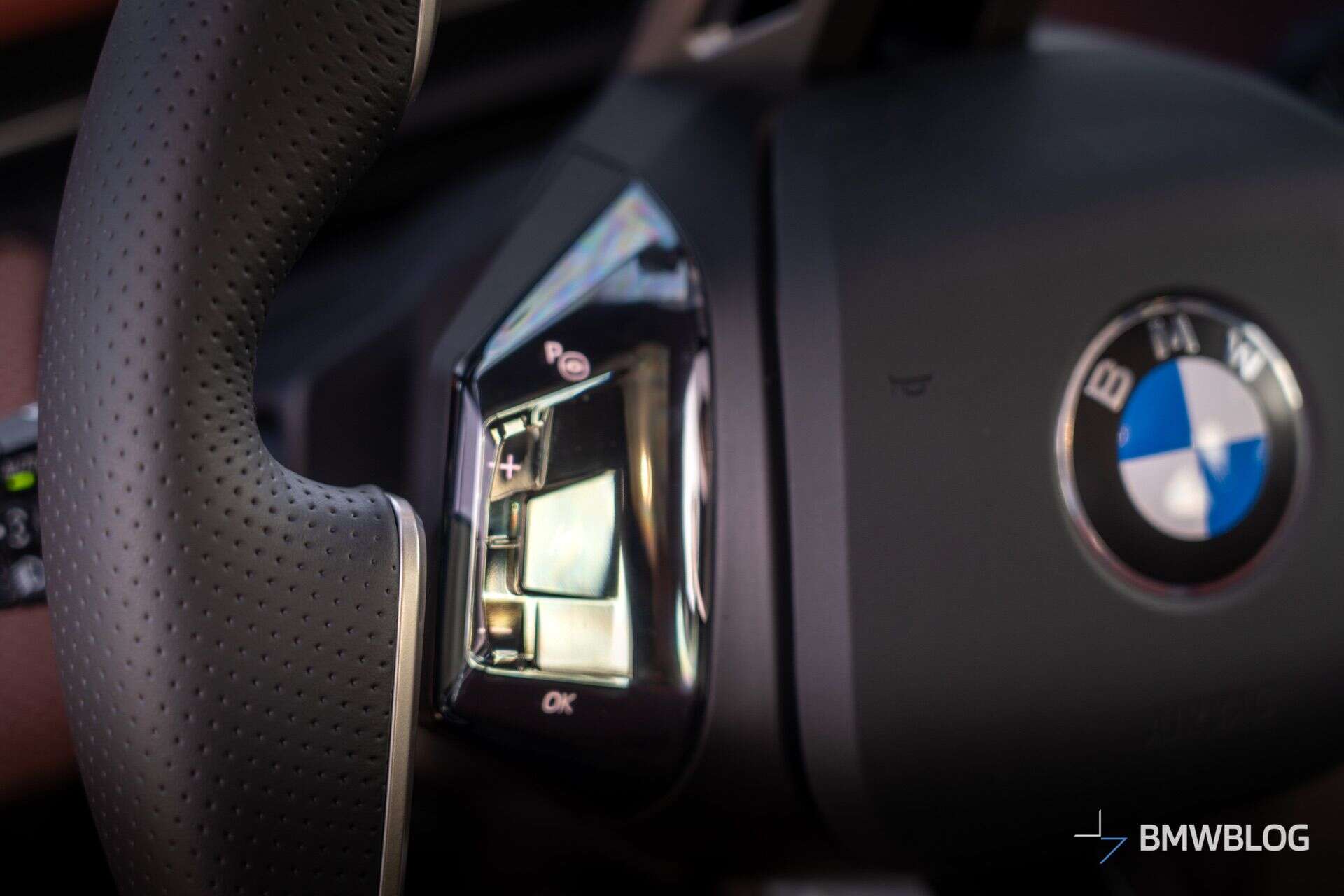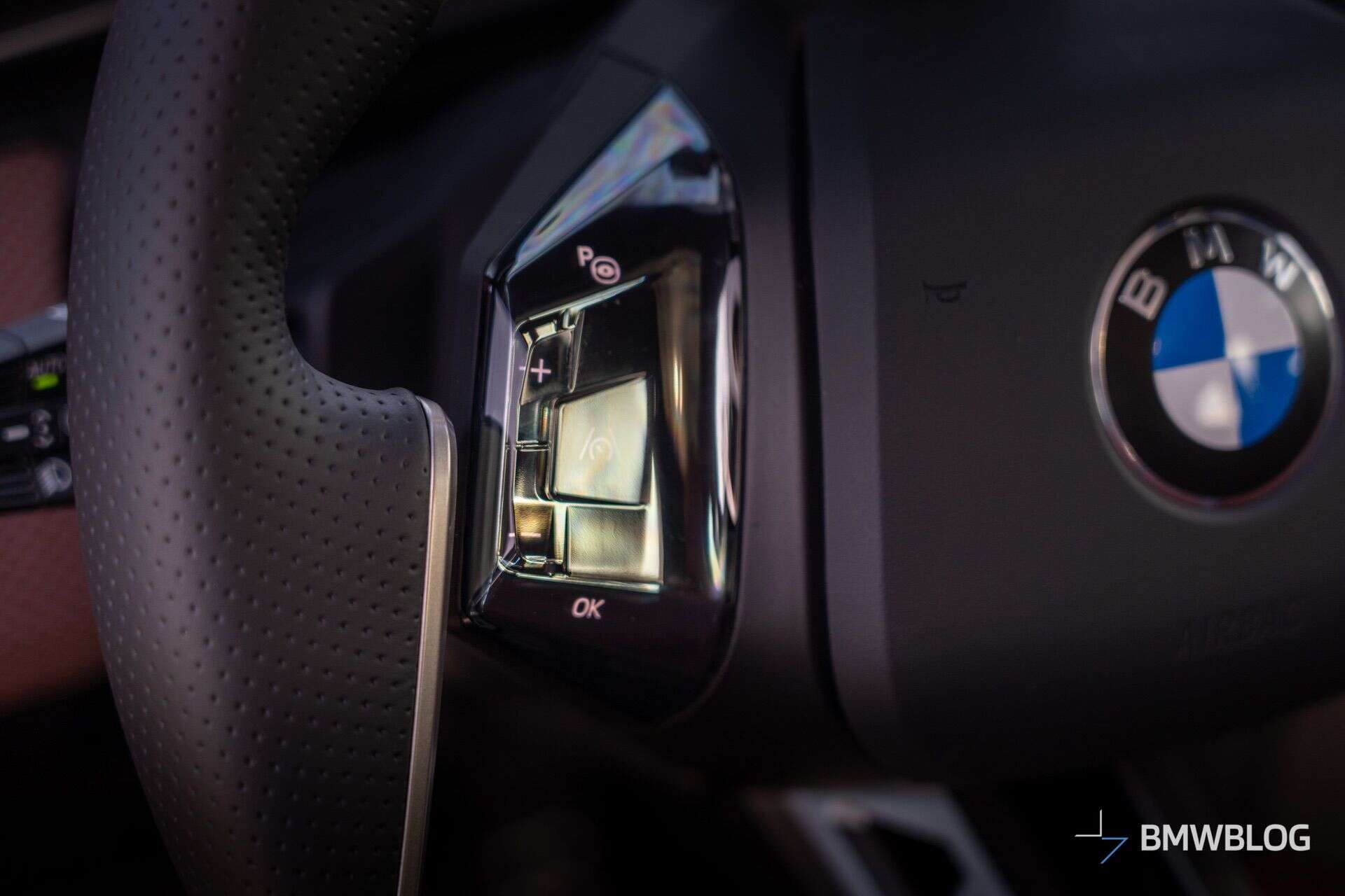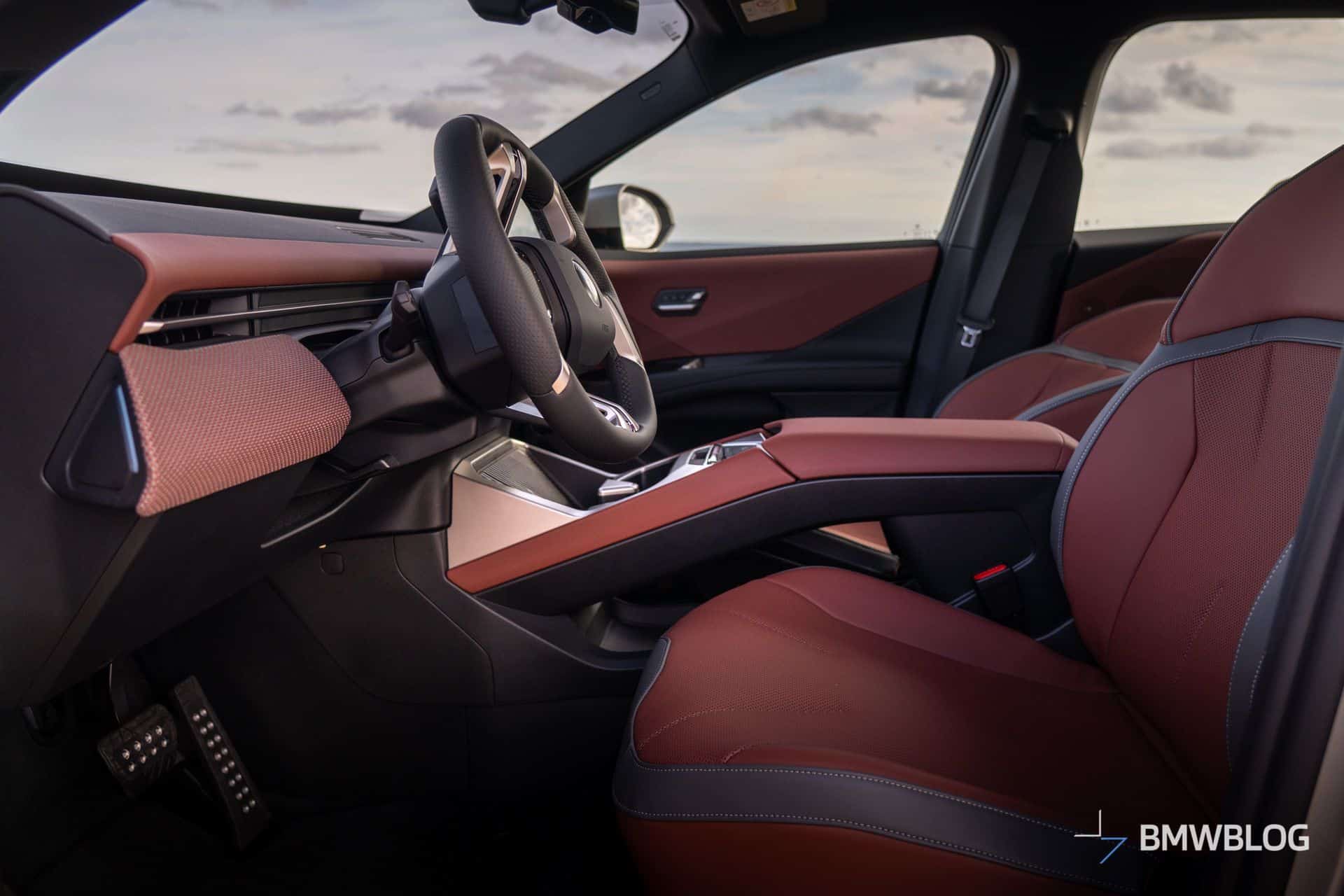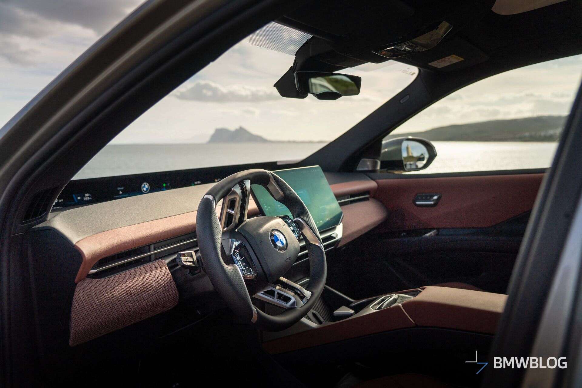 Inside is where the real treat awaits. The Castanea upholstery gives the cabin an upscale ambiance, even though it’s not genuine leather. It’s called Veganza in marketing jargon, a material said to have “leather-like characteristics.” The M badge on the steering wheel signals the upgraded design we’d definitely have over the standard wheel. It’s an option here on the 50 xDrive, but should come standard on the M Performance version, the M60.
