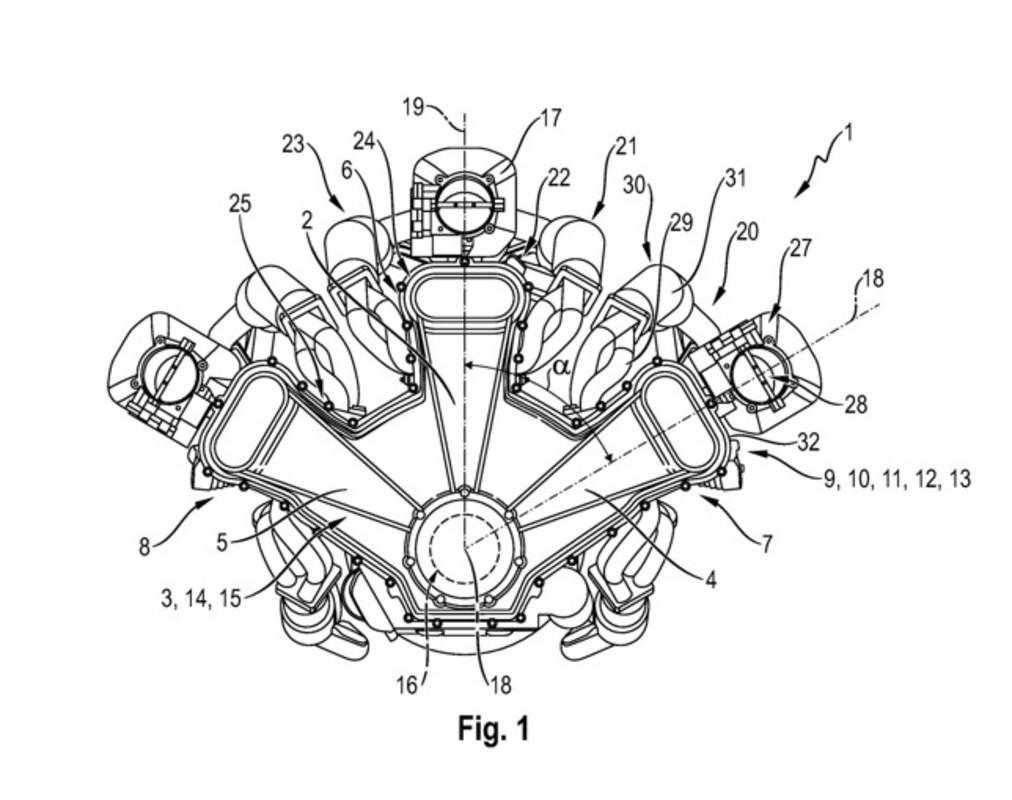 The patent details an engine comprised of three banks of 6 cylinders converging on a single crankshaft, with a 60-degree angle between each of the banks. While the attached drawings depict an 18-cylinder engine in this layout, Porsche has indicated that the design can be scaled down and adapted to have 3, 4, or 5 cylinders per bank, resulting in a 9-, 12- or 15-cylinder engine with a relatively short block. Additionally, while the 60-degree angle between banks has been chosen to offer optimal combustion and overall balance, according to Porsche’s engineers, this too can be varied to suit the application and packaging limitations.
