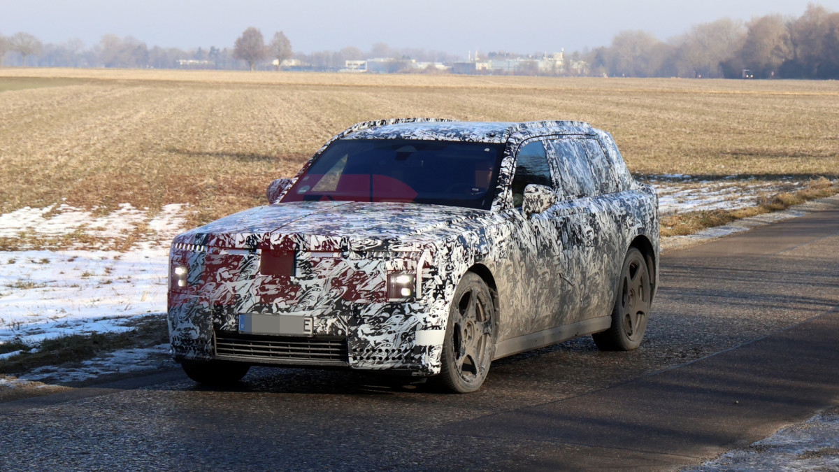The overall shape of this prototype closely matches that of the Cullinan, with a long hood, sharp shoulder and roof lines, and upright fascias front and rear. At the back, its taillights are dead ringers for those on the combustion-powered SUV, but the front is most intriguing. This features what appears to be a full-width LED strip within which numerous individual light accents add texture. Unlike a Cullinan, the outer extremities of the lighting design have a curve that looks almost Ford F-150 Lightning-like in these images, with square headlight clusters lower down.