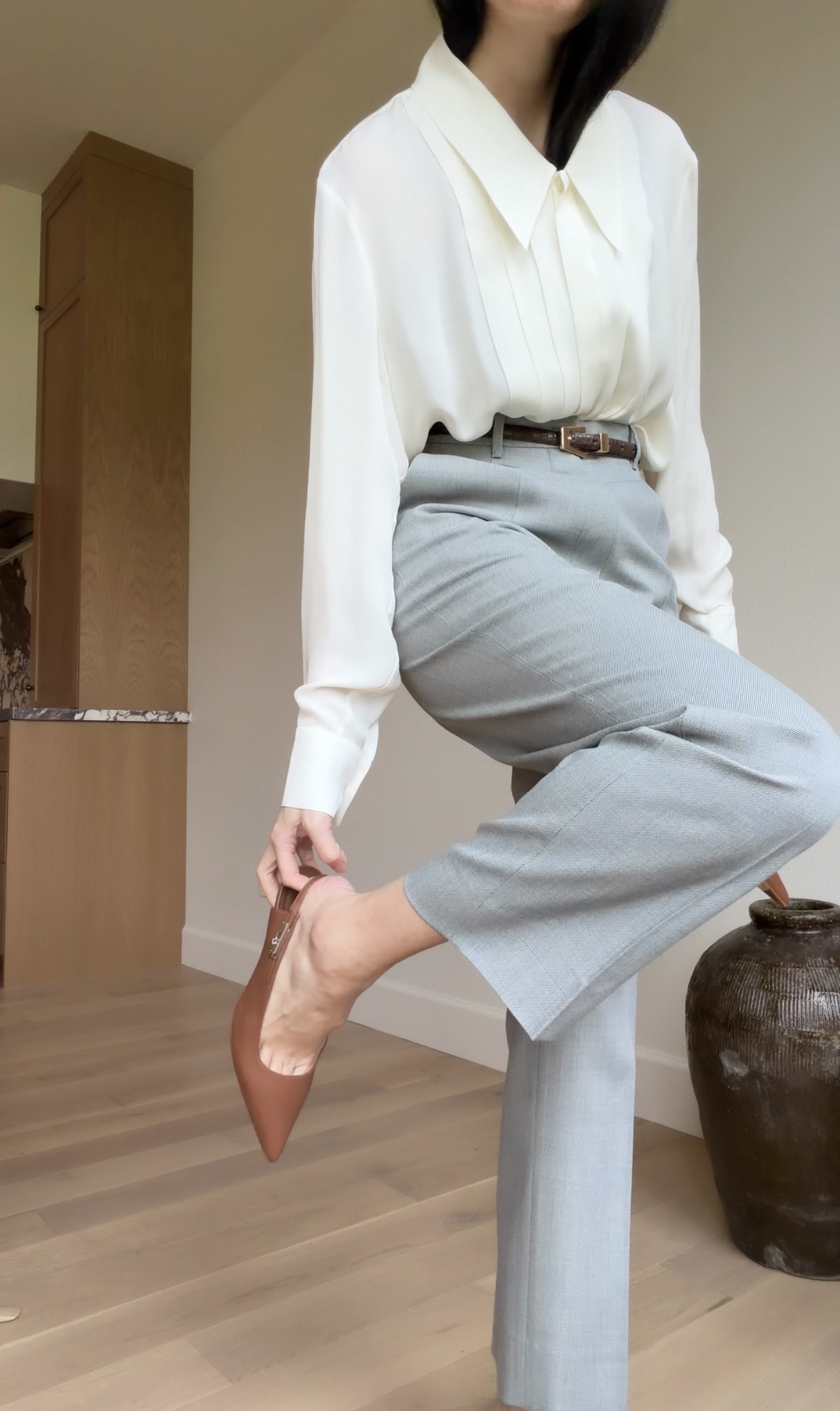 I might be breaking a major style rule here: between the gray pants, brown belt, camel shoes, navy jacket, and black bag… Colors you’re not supposed to mix. I guess it’s a good thing I don’t follow those rules. Happy Wednesday!