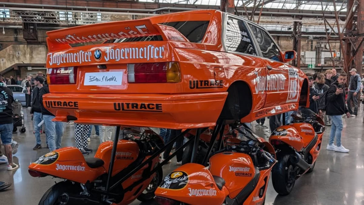 This E30 M3 build blends car and motorcycle culture, finished in the orange Jägermeister livery made famous by BMW’s early-1990s touring car history. It evokes the same nostalgic motorsport appeal as liveries like the now-banned Marlboro scheme.