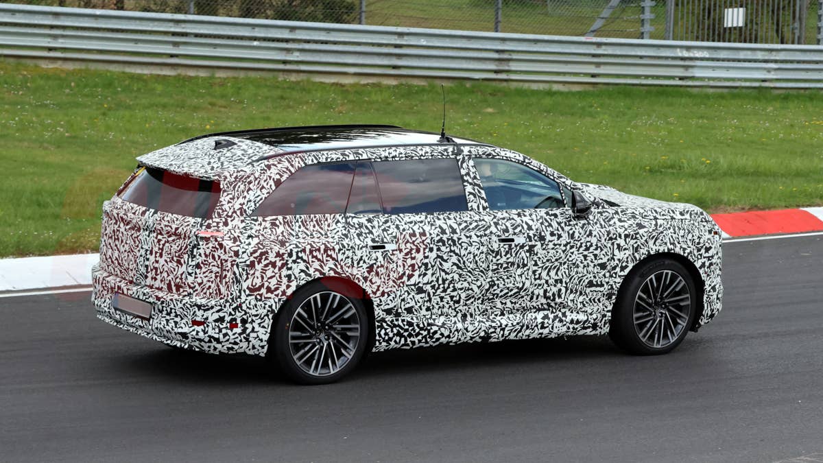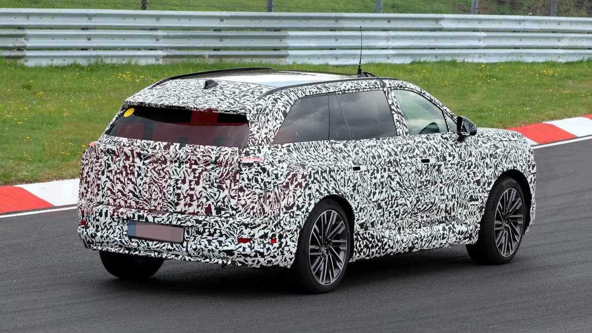 With plenty of vinyl camouflage disrupting the lines, it’s tough to get a clear understanding of the styling, but the rear three-quarter angle is particularly attractive, showing a slanted window behind the C-pillar, indicating that those in the third row will have a decent view out. From this angle, the slant of the window gives a bit of Escalade IQ flavor, and like that vehicle, the rear windshield is relatively small, thanks to a sudden sloping of the roof. This helps create a sporty feel, but it appears that there’ll be plenty of headroom and cargo space. Muscular rear haunches draw the eye to a full-width taillight bar, but the side indicator lights are placed lower down and nearer the extremities of the rear fascia. Also apparent is a low tailgate opening that will make loading easy.