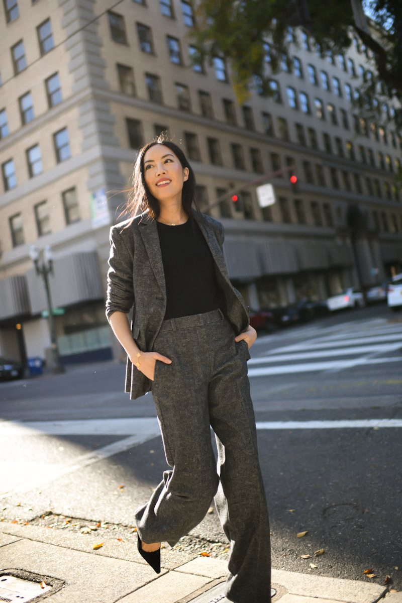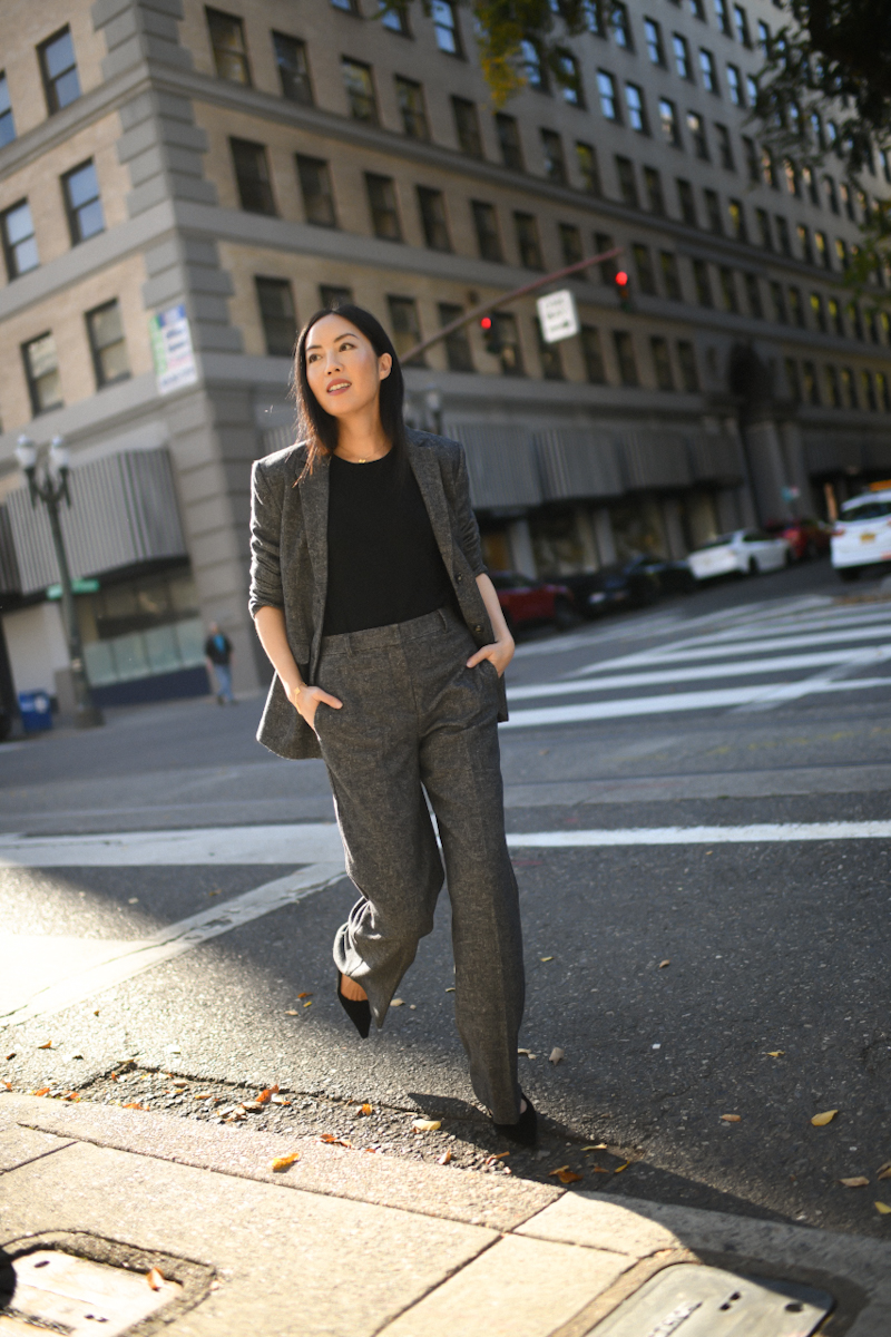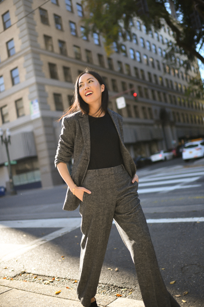The suit: a workwear staple. This one is slightly thicker for cooler weather, textured for interest and has the perfect wide leg cut. Let’s go, Monday!