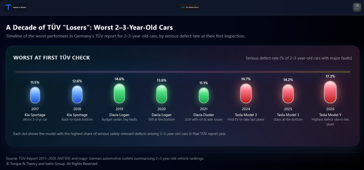 Figure 2: This timeline marks the worst car for defects in each TÜV report year. The line ends with the Tesla Model Y, which earns the highest “worst of the year” defect rate in a decade.